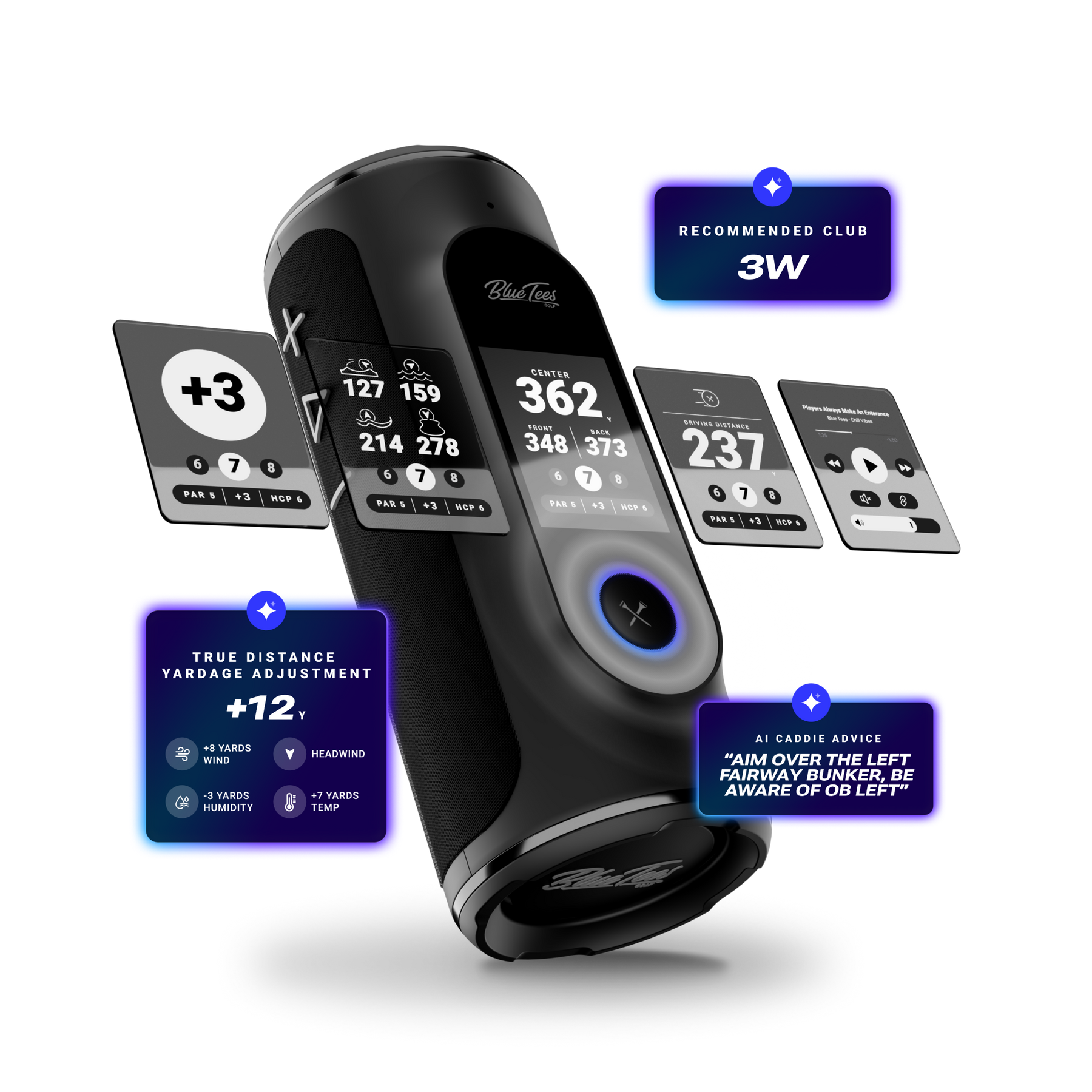 In a world where precision is paramount and accuracy is everything, only the best can rise to the top. Welcome to the future of golf. Meet Player+, a revolutionary GPS Touch Screen Golf Speaker powered by the Blue Tees GAME APP. A powerful speaker unlike anything you’ve seen before, get access to over 42,000 courses at your fingertips with an out-of-this-world sound experience.