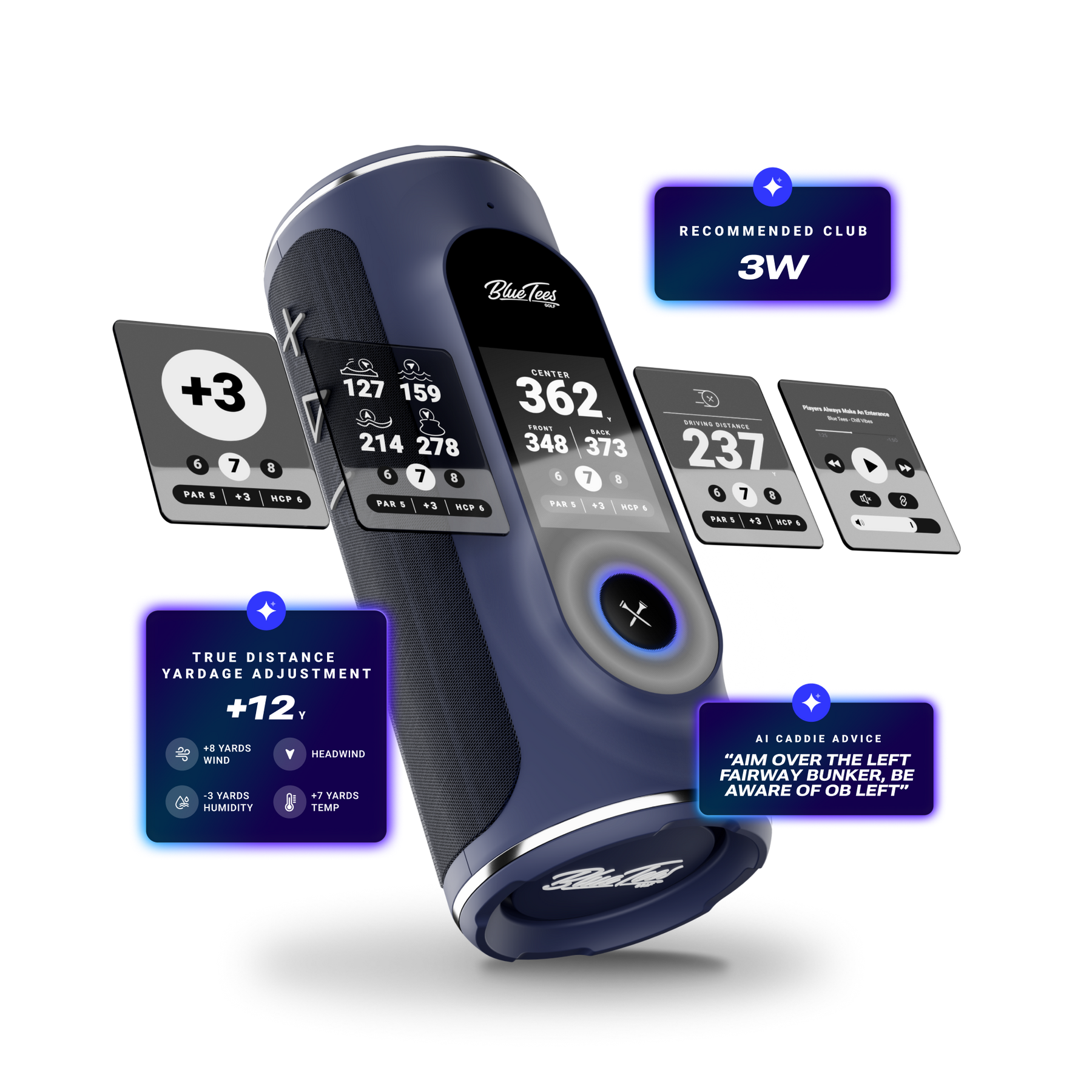 Our smallest and most compact speaker yet. It delivers a rich audio experience, audible GPS readings, built-in magnet, and pairs seamlessly to the Player+ for true surround sound. *Audible F/C/B Distances FREE for life. With an active Blue Tees GAME app membership, you can get hazard & driving distances, club selection assist and much more.